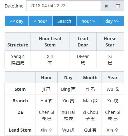 In Qi Men Dun Jia forecasting, the Day stem usually represents the person concerned and the Hour stem represents the outcome of what the real objective.