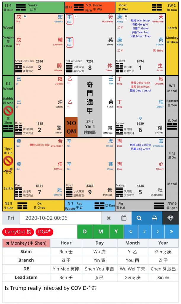 In Qi Men Dun Jia forecasting, we can use the year stem to represent the candidate too. Trump is born in 1946 (Bing 丙 stem) while Biden is born in 1942 (Ren 壬 stem). From the Figure 1, it shows that Bing 丙 stem is in Northwest (NW) palace while Ren 壬 stem is located in South (S) palace. Again, NW palace consists of UTortoise (玄) deity influence, SHeart (心) star and DSeclusion (杜) door. From these combinations, President Trump is lying about his real condition, to secretly plot another scheme to turn the current situation to his favour.
