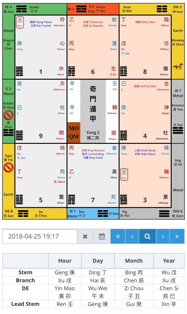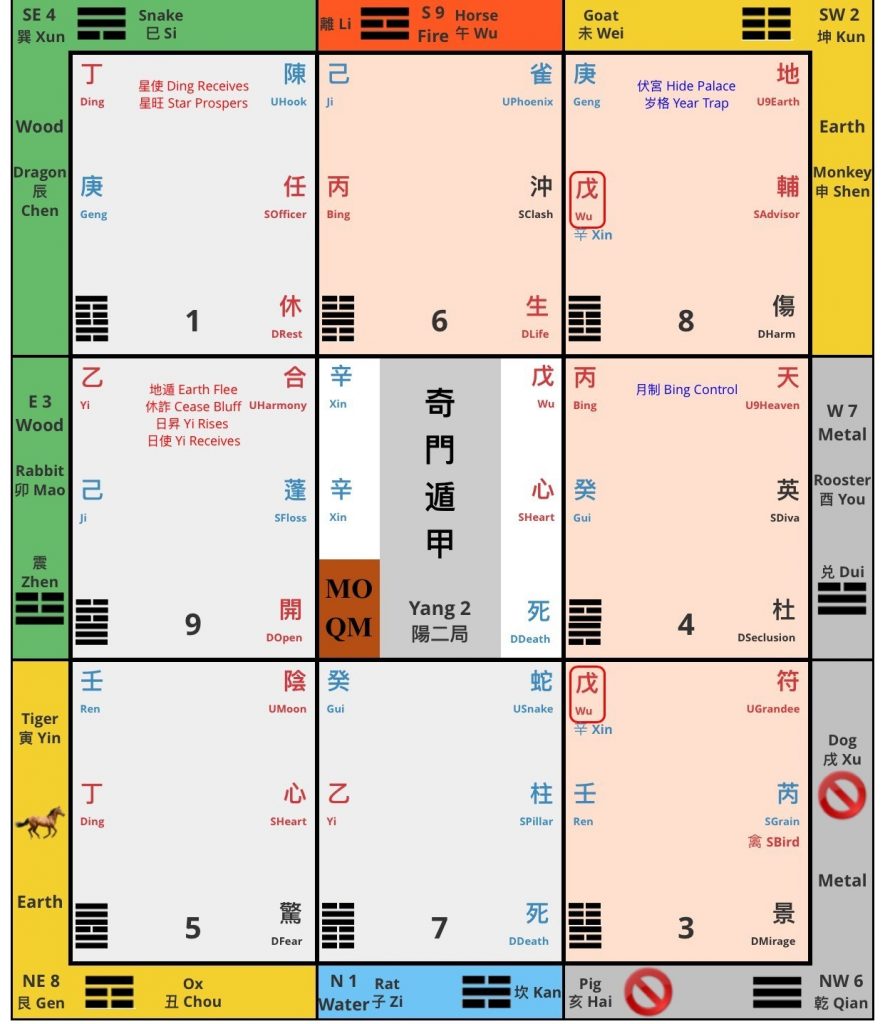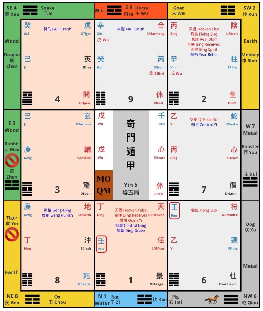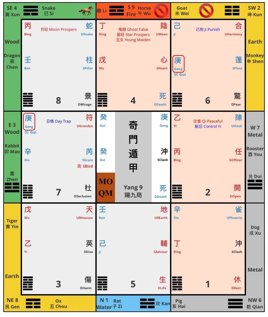 The Day Stem Ji 己 (the asker) in the SE palace and the Hour Stem Geng 庚 (the candidate) in the NW palace. From the Hour Stem Geng 庚 in the NW palace, the palace consists of DSeclusion 杜 door, SFloss 蓬 star with U9Heaven 天 deity. This means the candidate honesty during the interview is questionable and he has a strong desire of getting what he wants! This behaviour is not suitable in a work place as he might do something against the company policy for his own interest. In addition, the NW palace counters the SE palace of the asker, another indication of the unsuitability of this candidate for the asker.